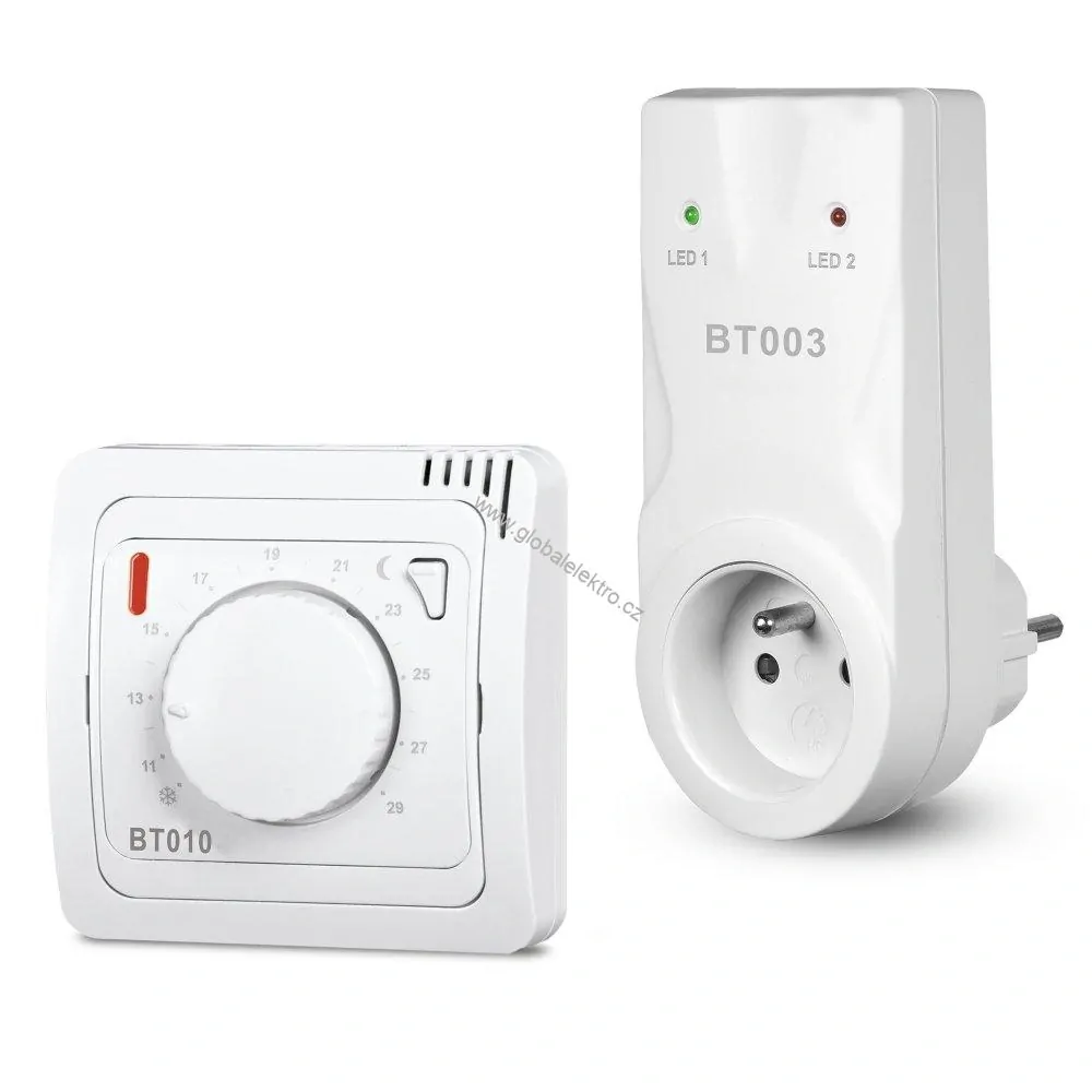 BT013 je bezdrátový termostat se systémem samoučení kódů, jednoduchým ovládáním pomocí kolečka a přijímačem do zásuvky.